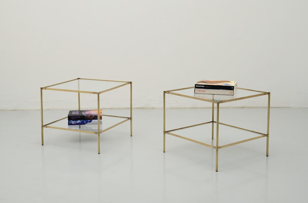 Caccia Dominioni, coppia di eleganti tavolini in ottone con ripiani in cristallo, Azucena, 1958.