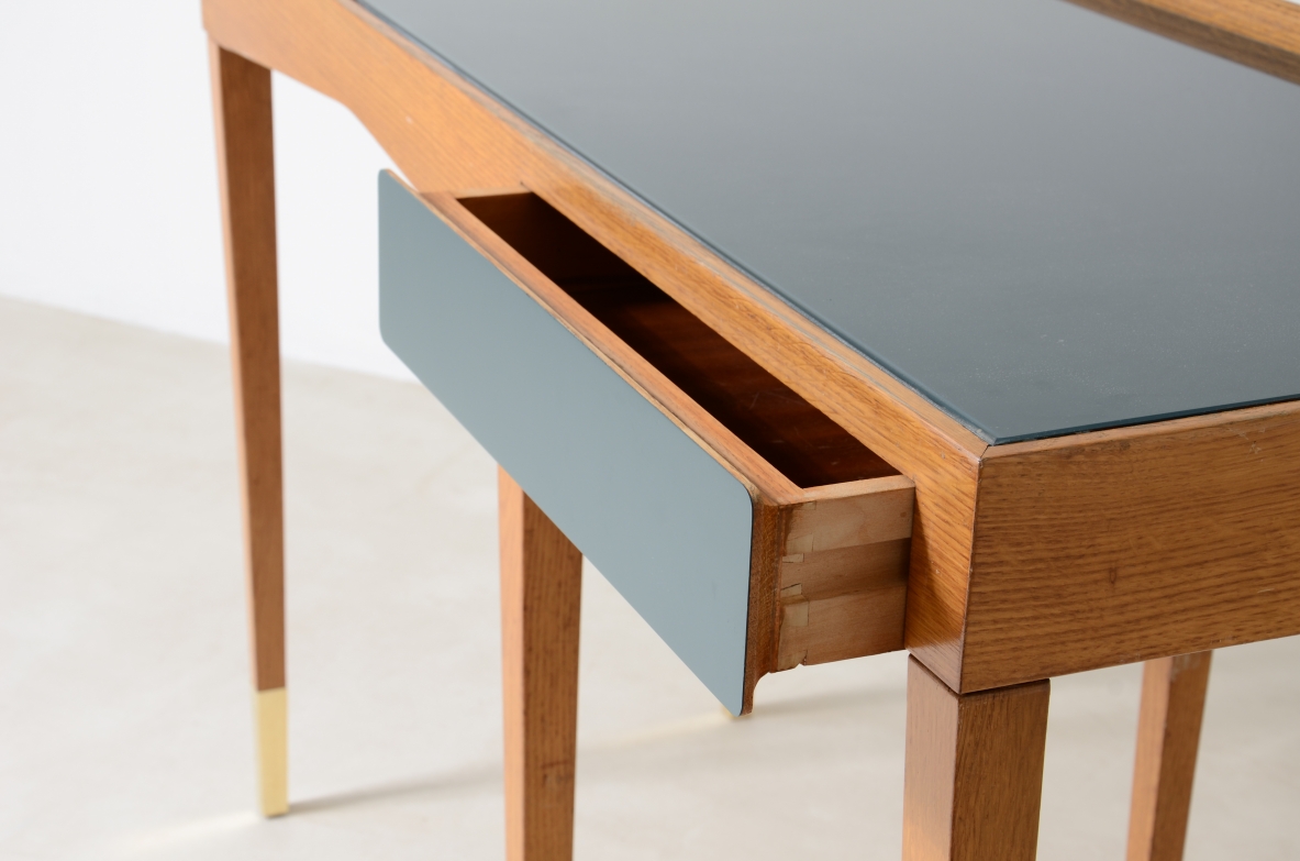 /en/detail/oak-writing-desk-with-petrol-green-opaline-glass-top-and-backsplash-Shaped-drawer-of-the-same-color-covered-in-polypropylen-Long-thin-legs-with-brass-tips-Attribute-to-Gio-Ponti-manufacture.