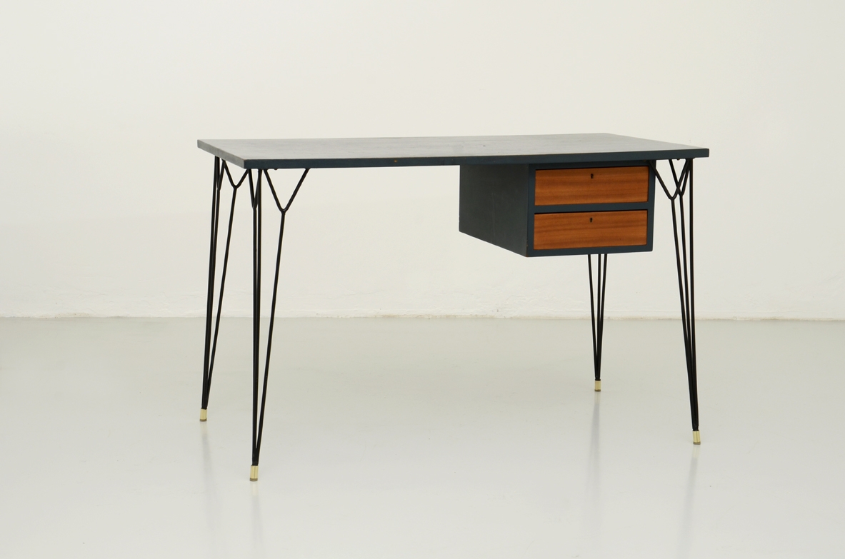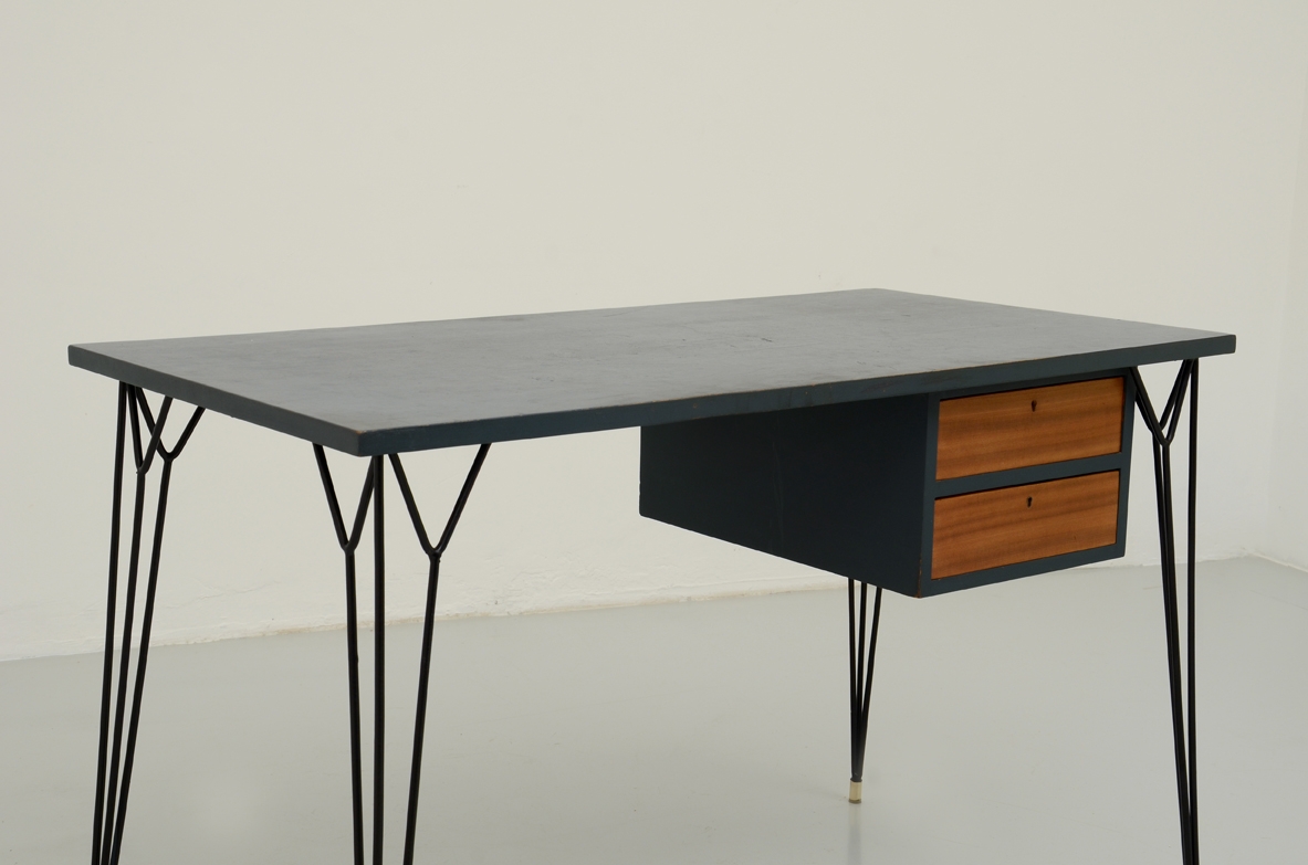 /en/detail/refined-writing-table-with-metalwork-structure-and-dark-green-painted-top-with-teak-drawers-denmark-1950s