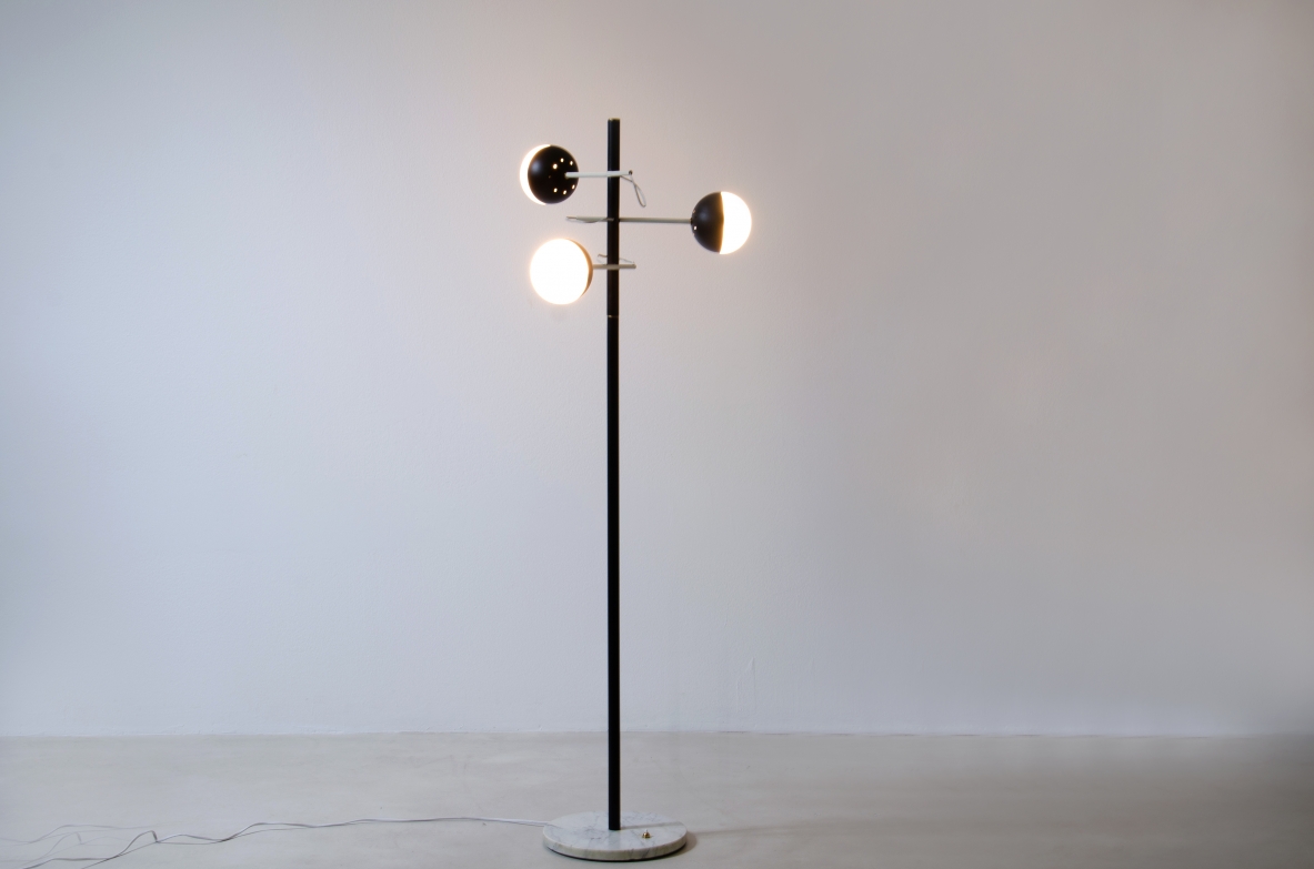 Floor lamp with structure in lacquered metal and diffusers in metal and opaline glass.