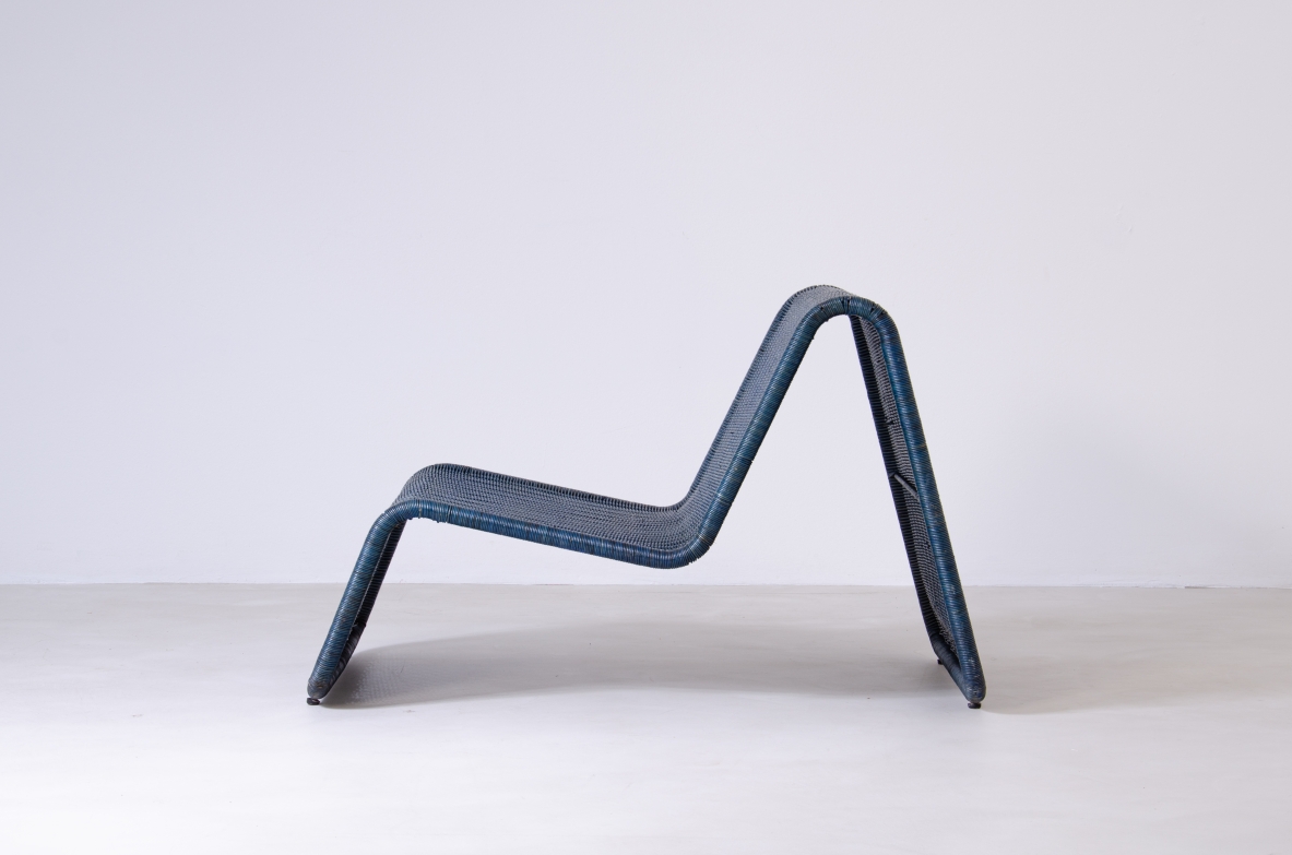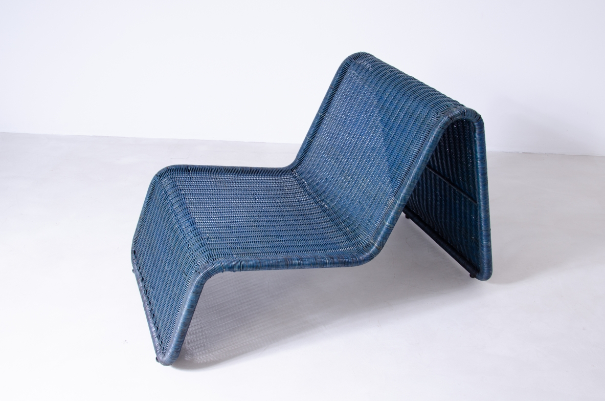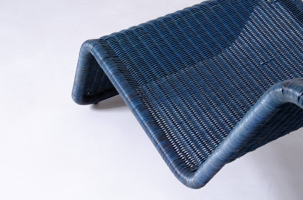 This chaise longue in blue rattan had been custom made as a unique piece.
