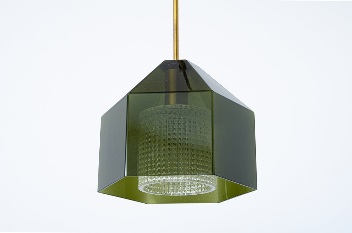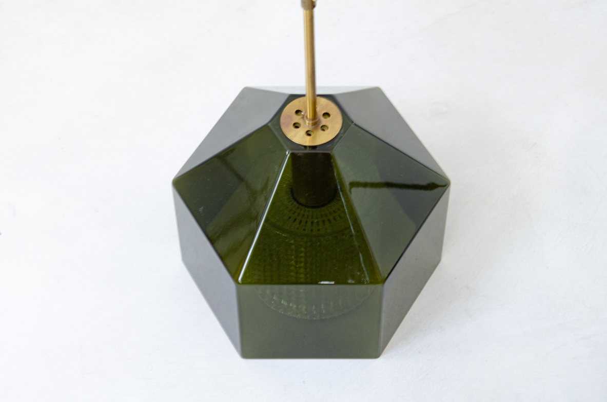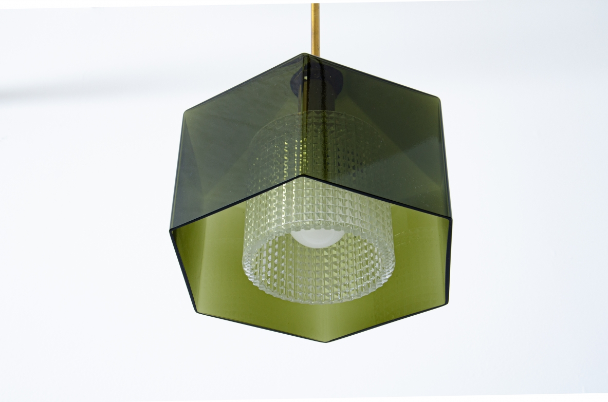 Rare pair of small hexagonal chandeliers in gray / green ground glass with transparent glass crown inside and brass wire guide.