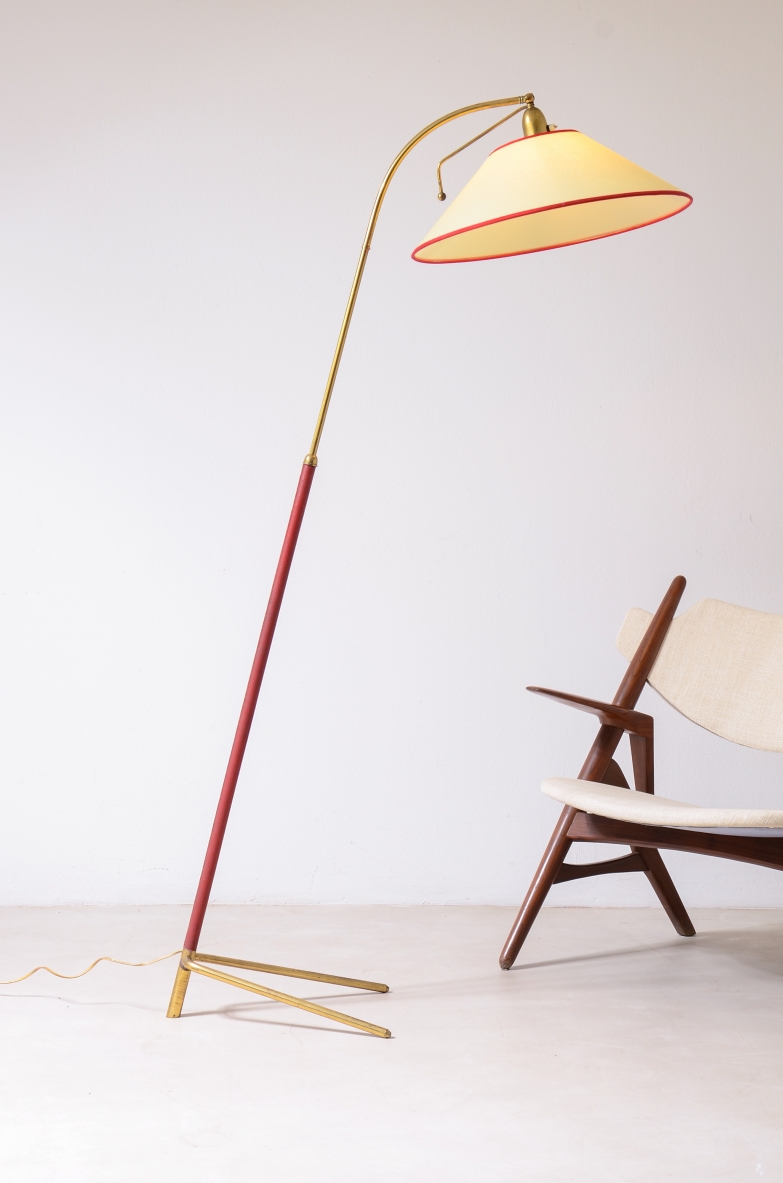 Lampada da terra con stelo rivestito in pelle rosso scuro e ottone, braccio regolabile e cappello in pergamena con profili in tessuto blu notte.