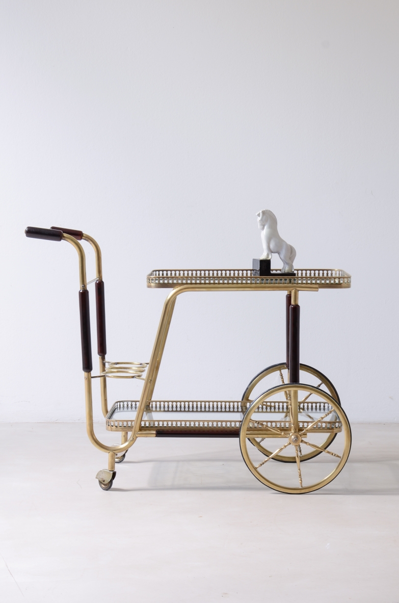 Carrello bar con due piani a vassoio in vetro molato e ottone con dettagli in legno tornito.