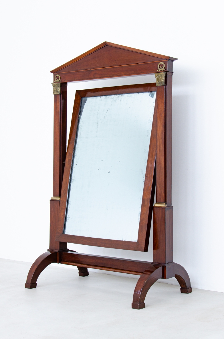 Grande specchiera basculante con specchio originale a mercurio, struttura in legno con timpano di gusto neoclassico e mezze colonne con dettagli in bronzo.