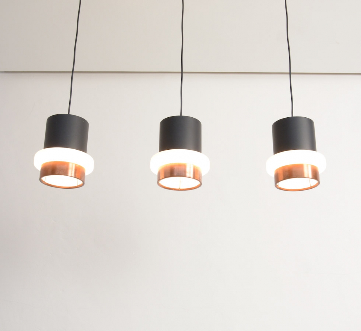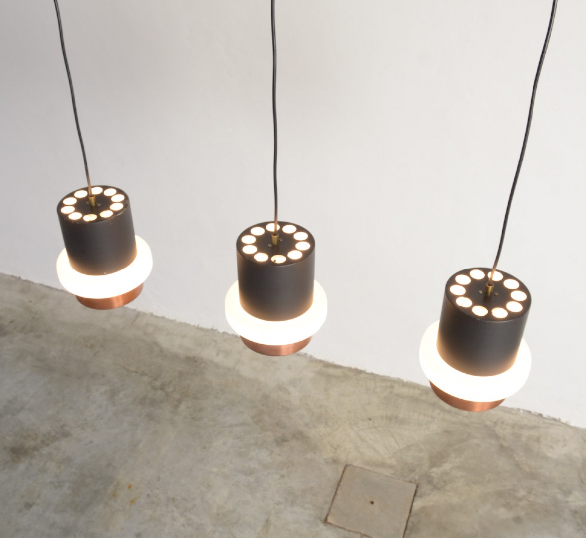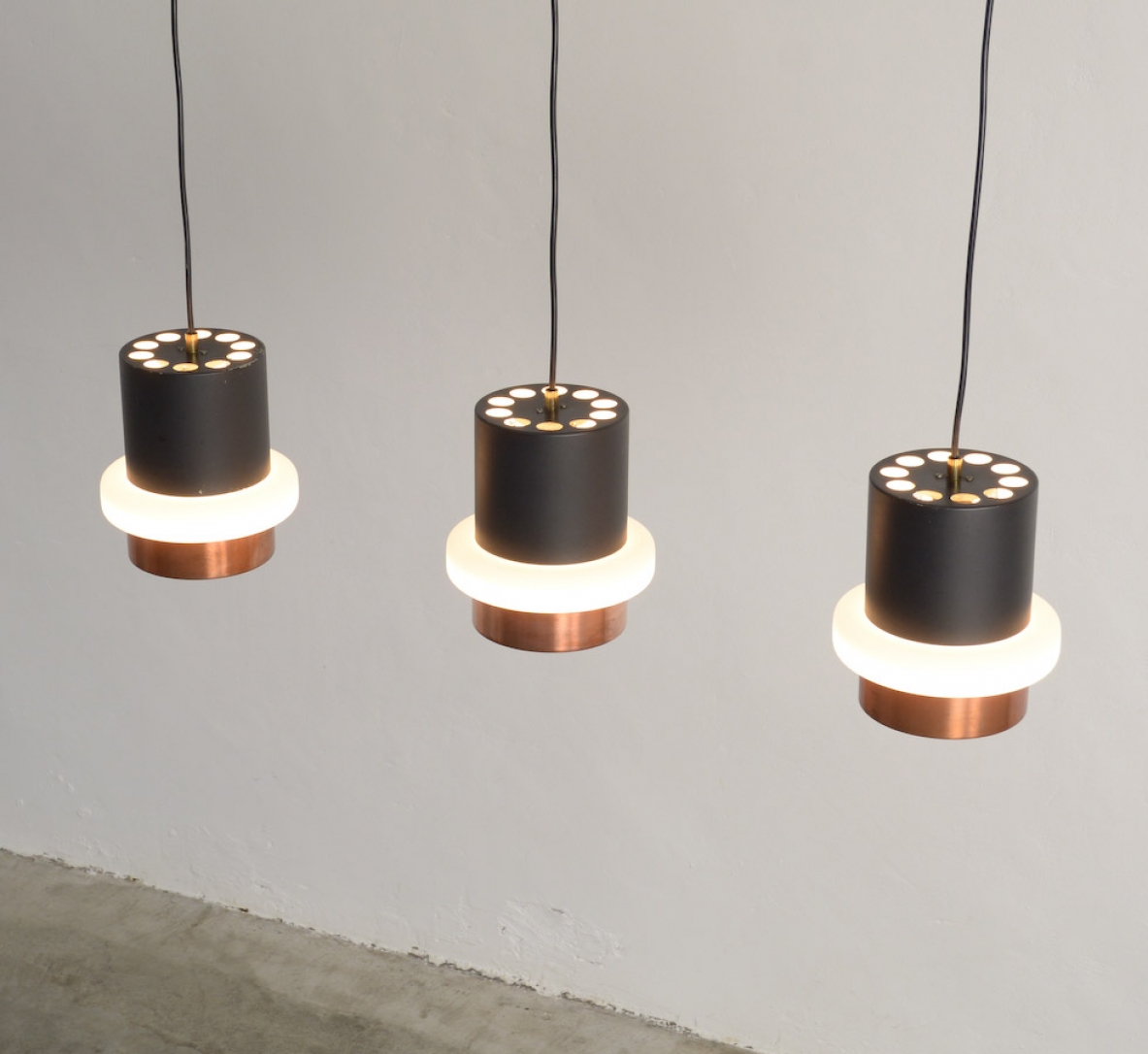 Jo Hammerborg, set di 3 lampadari in rame, metallo laccato e diffusori in vetro opaline, prod. Fog&Morup, 1957.