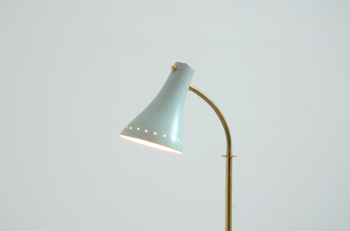 /en/detail/oluce-little-floor-lamp-with-a-light-blue-perforated-metal-shade-and-brass-stem-1950s