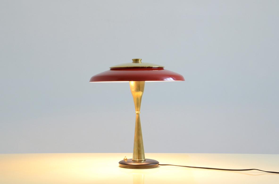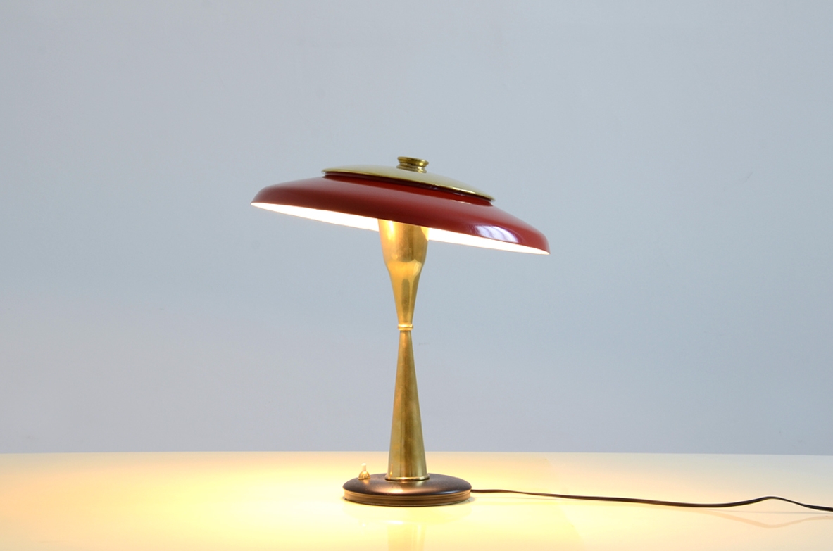 Oscar Torlasco, rara lampada con stelo a clessidra in ottone e cappello regolabile laccato di rosso. Prod. Lumi, 1950ca.