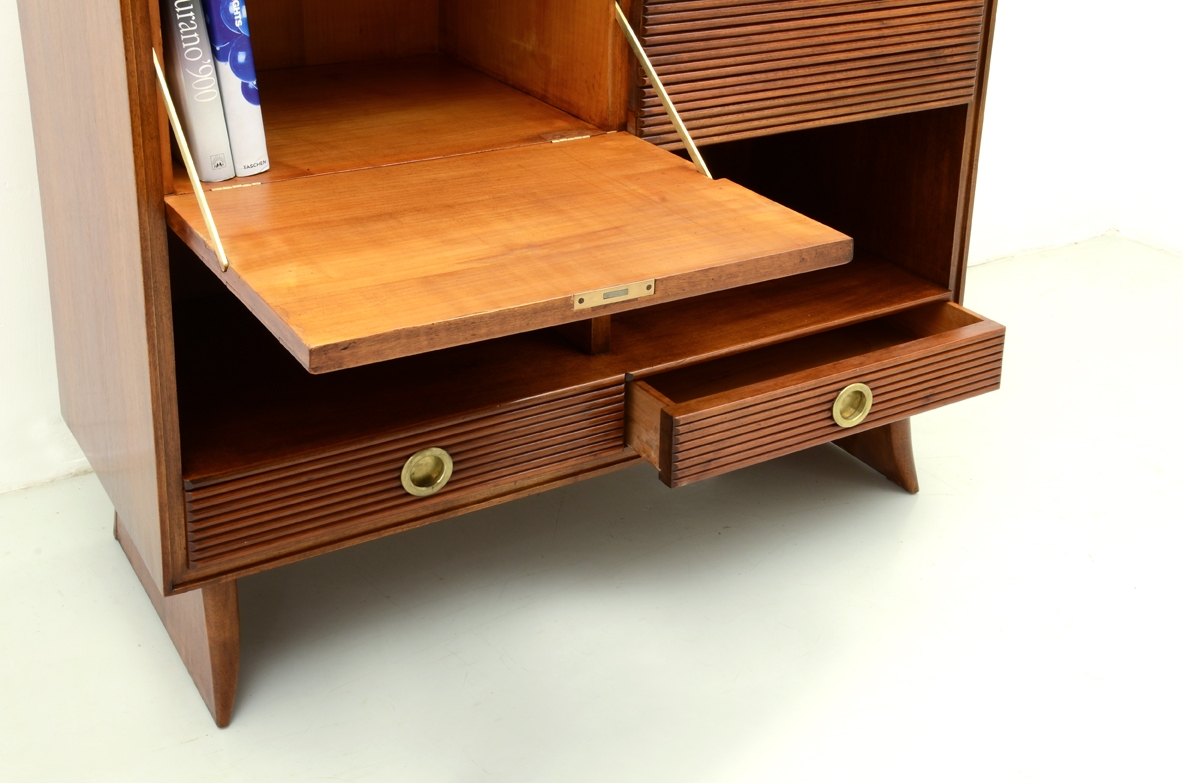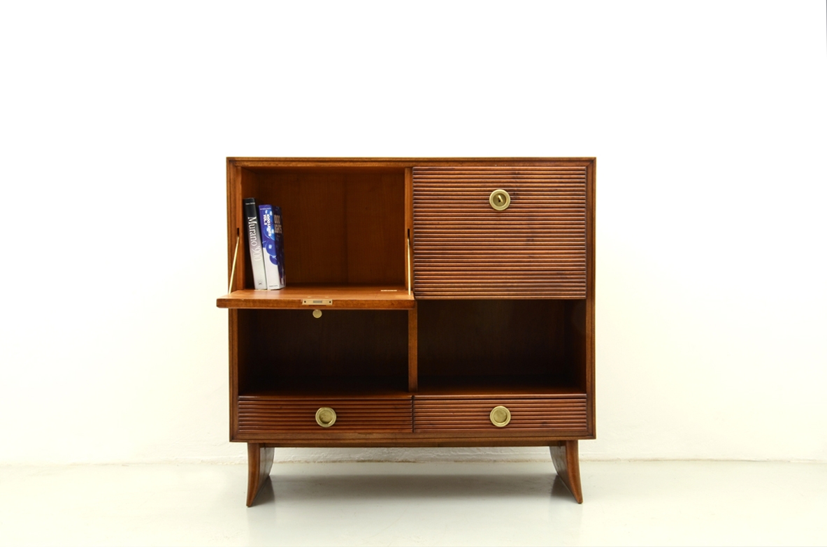 Paolo Buffa, elegante mobile in legno grissinato a due ante a ribalta e due cassetti con belle bocchette in ottone, 1935.