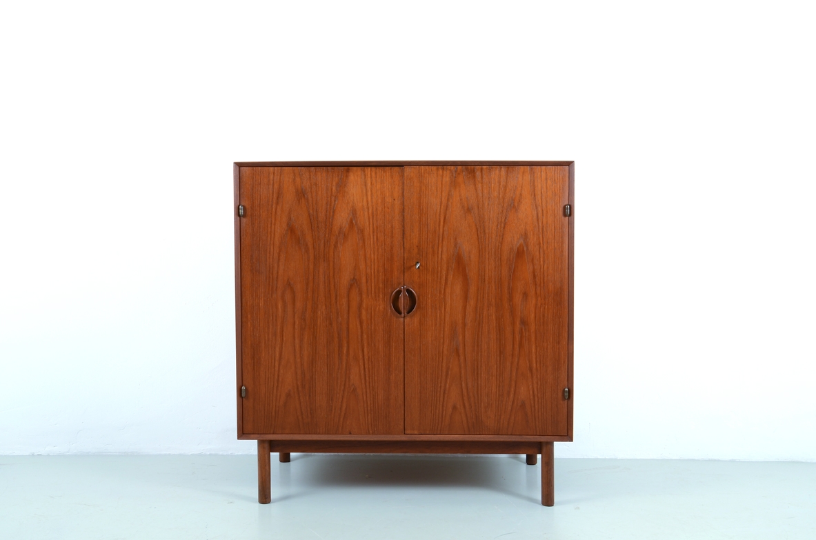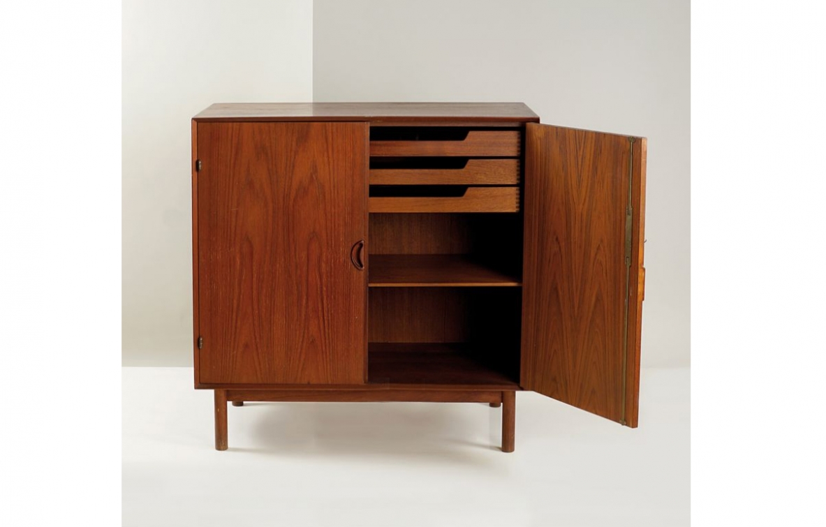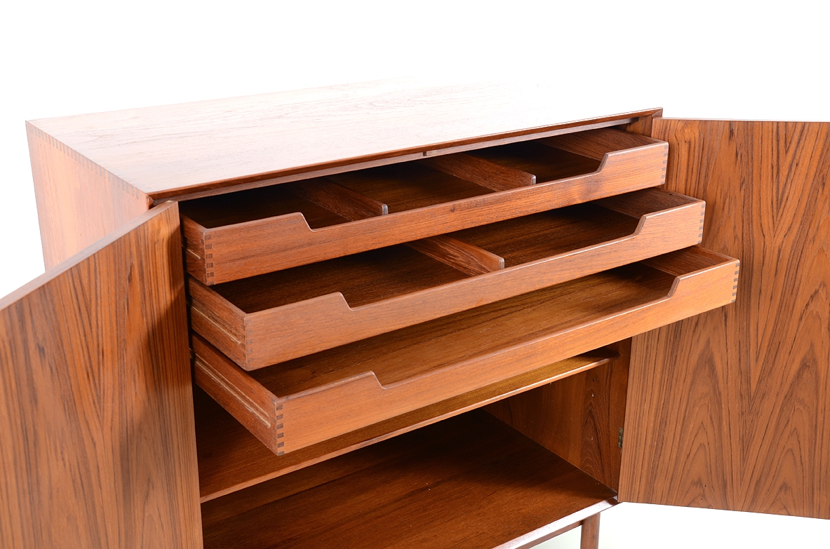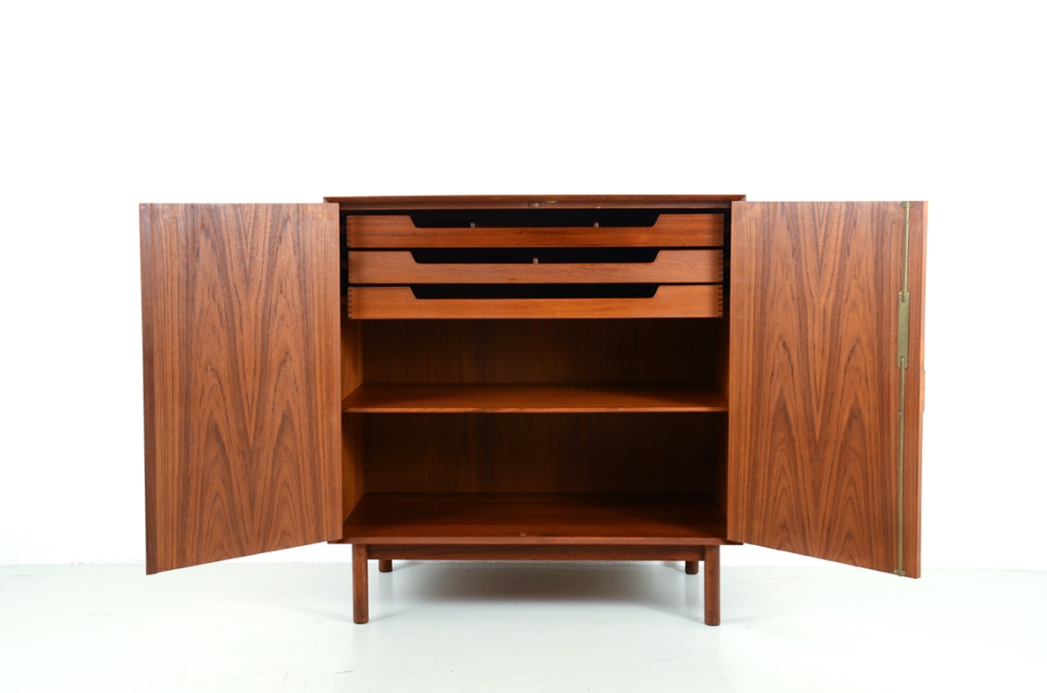 Peter Hvdt & Orla Mølgaard-Nielsen, piccolo mobile in tek a due ante con cassetti e ripiano all'interno, Danimarca 1955ca.