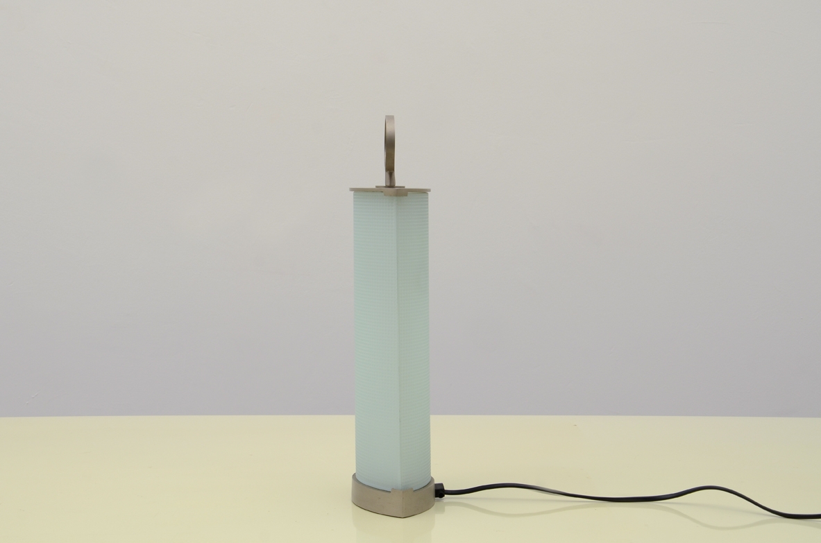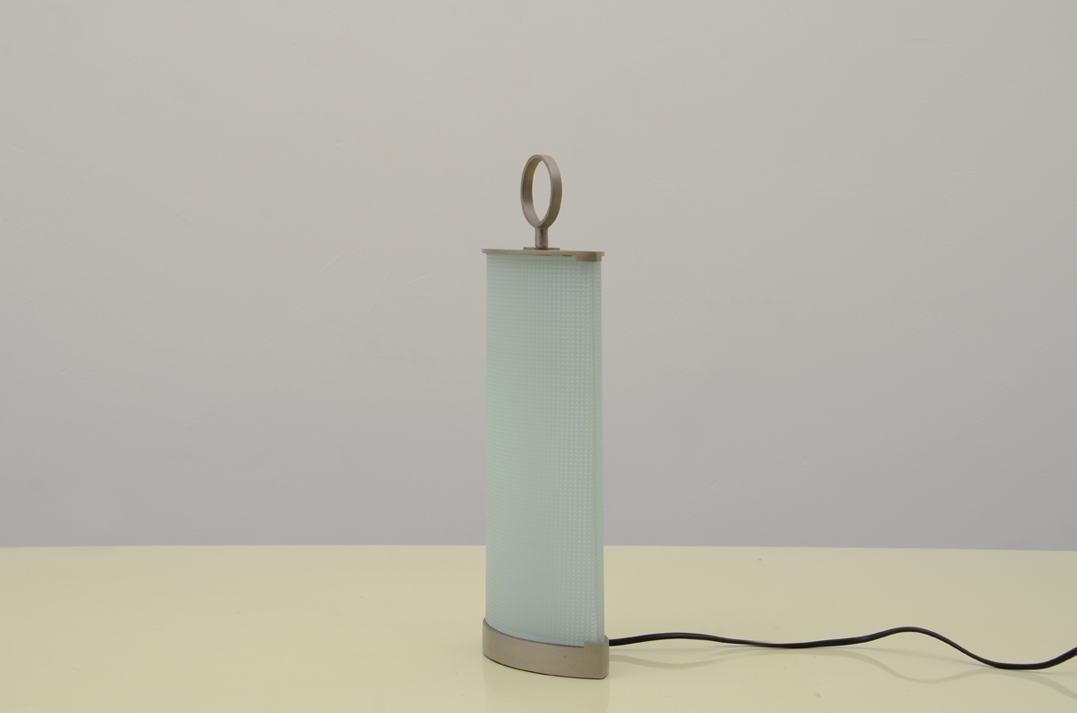 Pirellina, lampada da tavolo con diffusori in vetro stampato e curvato. Prod. Fontana Arte, Gio Ponti 1967.
