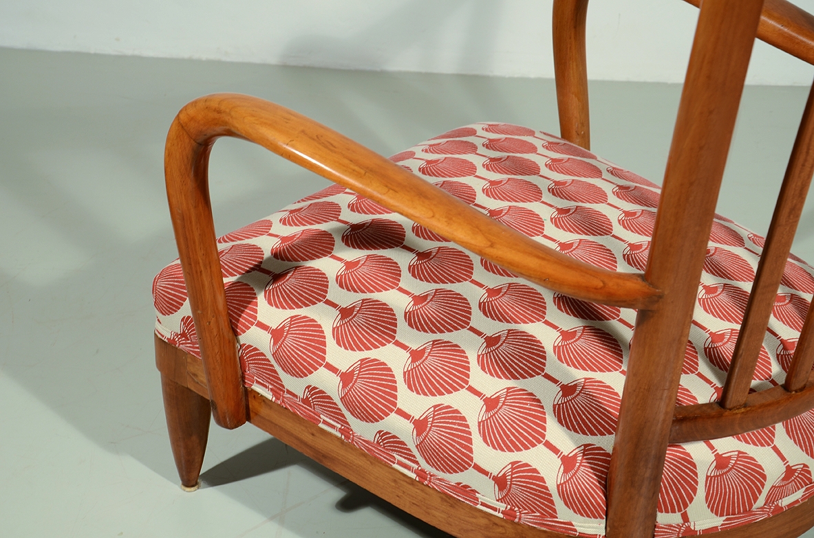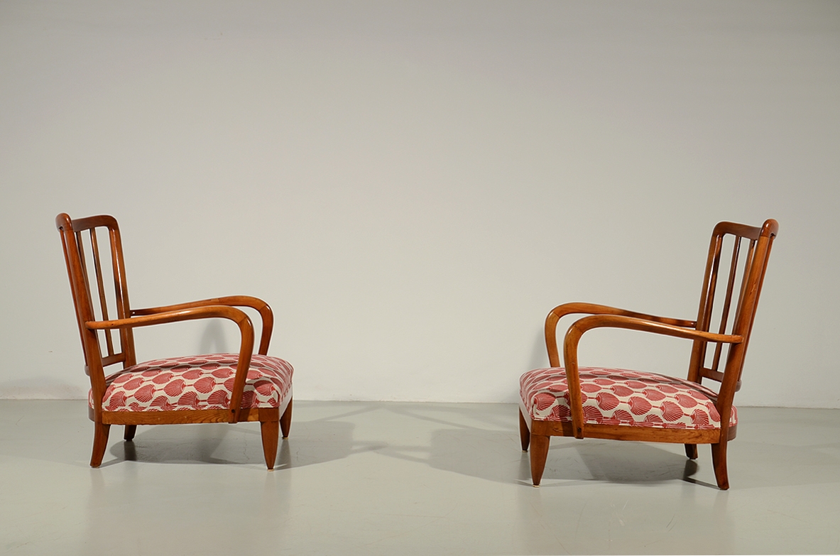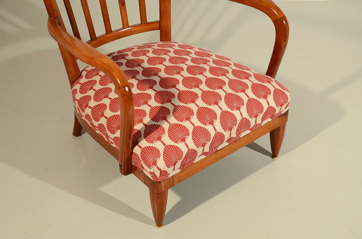 Raffinata coppia di poltroncine in ciliegio con seduta imbottita. Attr. Paolo Buffa 1940ca.
