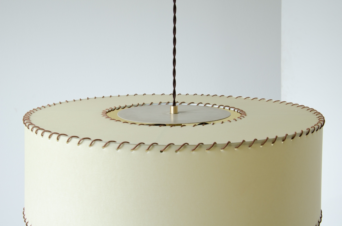 Rara lampada da parete estensibile modello '1102' per OLuce con braccio in legno e ottone e grande paralume in pergamena cucita e perplex, 1960ca.