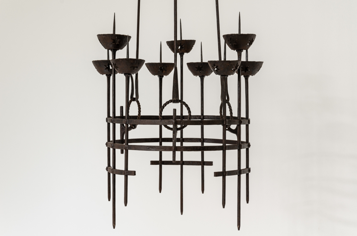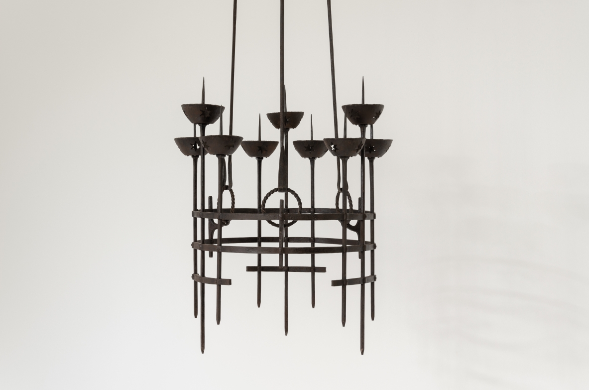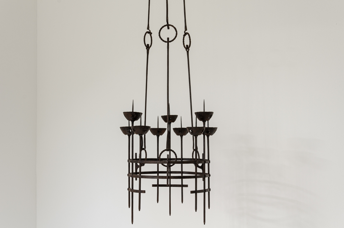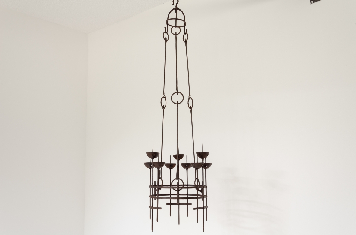 Alessandro Mazzuccotelli, candelabro a sospensione in ferro battuto, fine XIX–inizio XX secolo.
