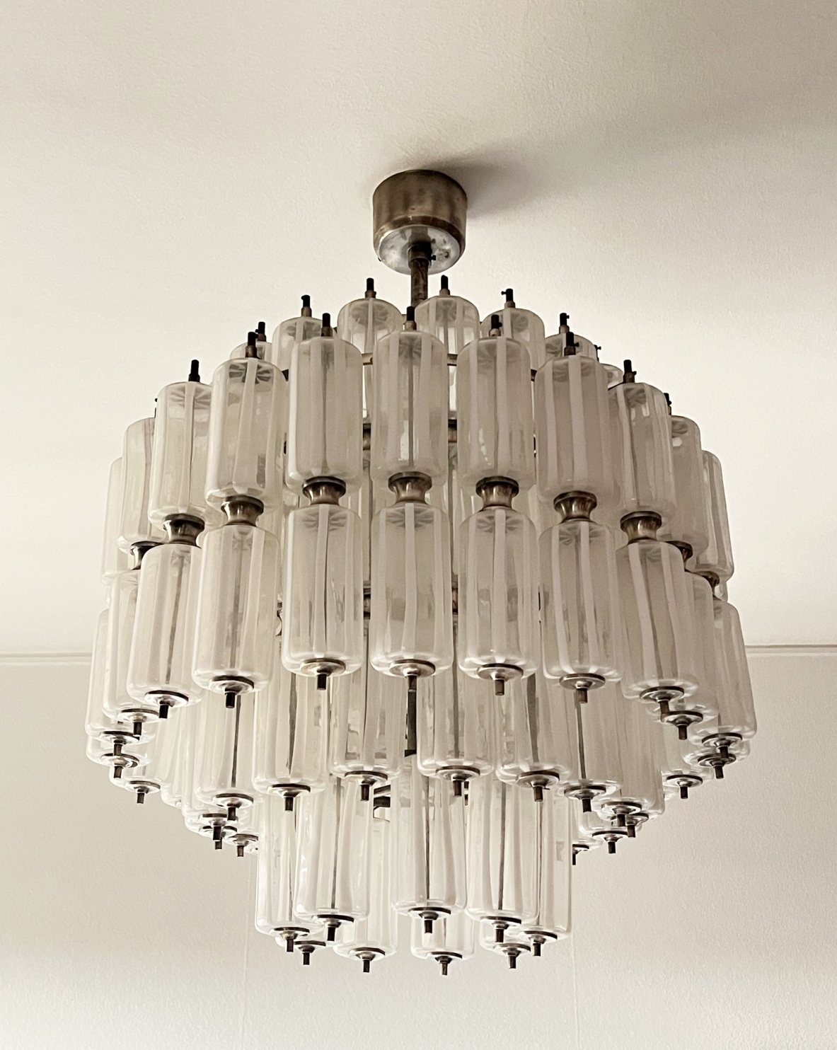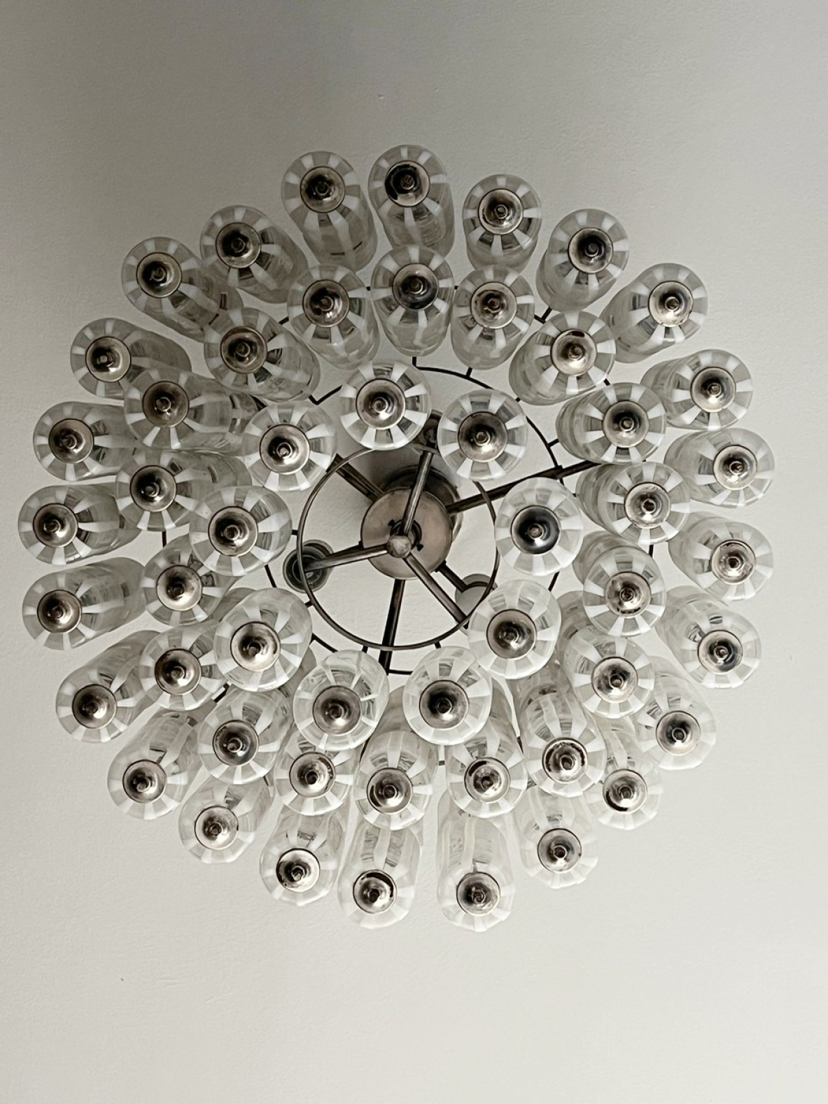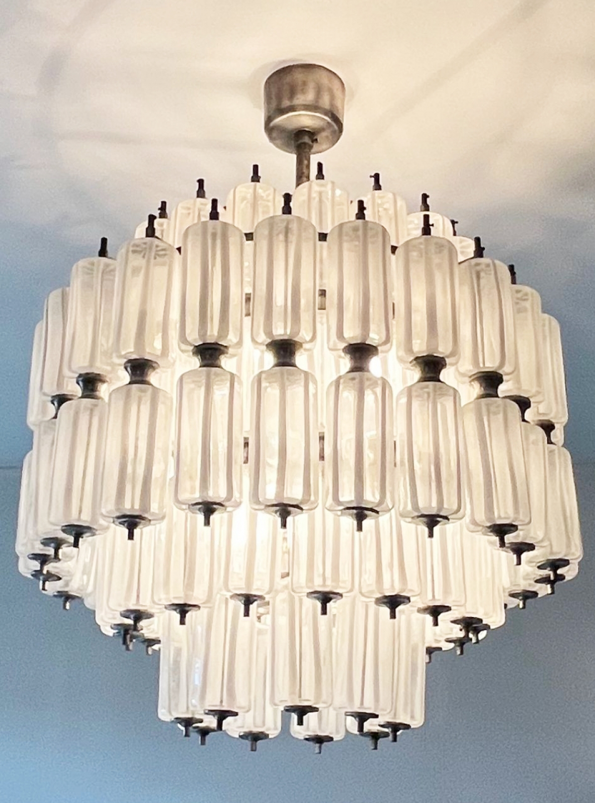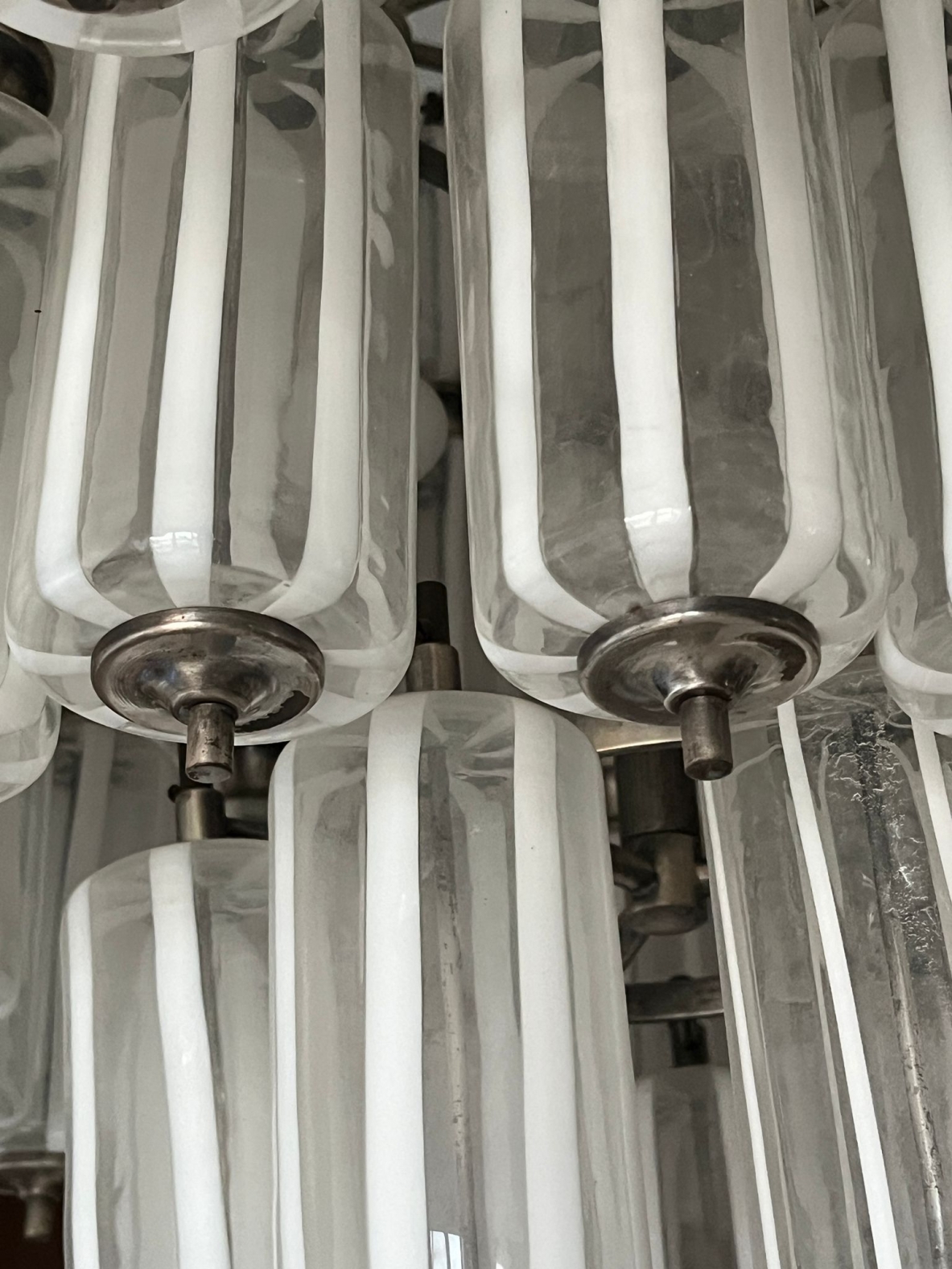 Importante lampadario in vetro di murano composto da 110 elementi a cilindro trasparenti dipinti a fuoco secondo la tecnica a lattimo.