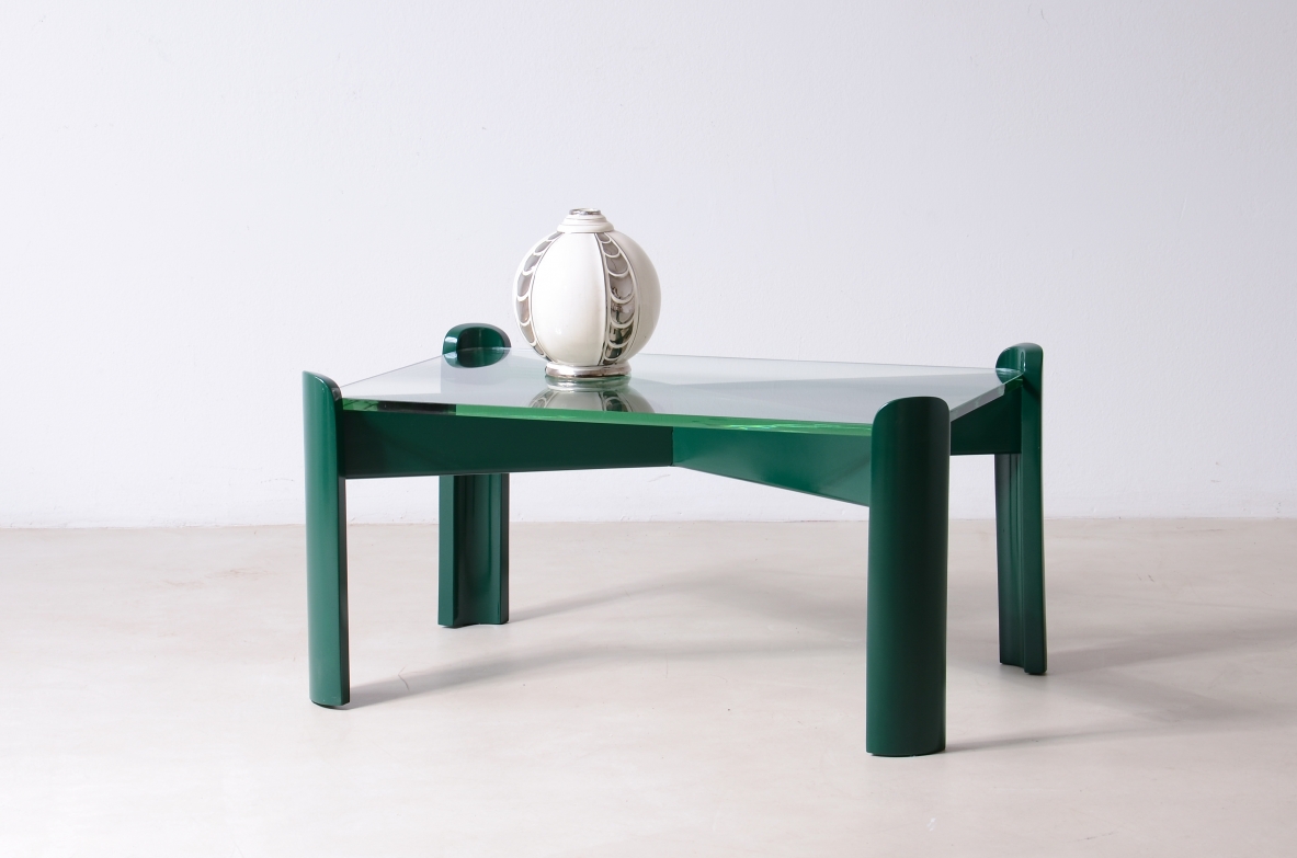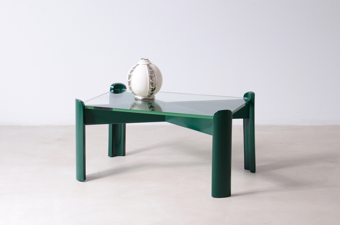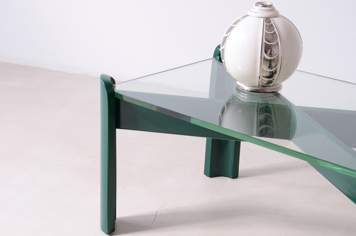 Due tavoli bassi da sala in legno laccato con piano in cristallo di forte spessore color verde Nilo. Modello unico laccato verde inglese per una committenza privata.