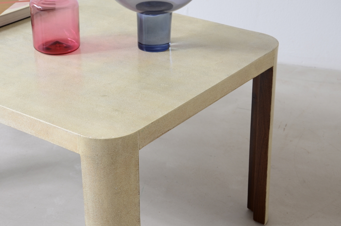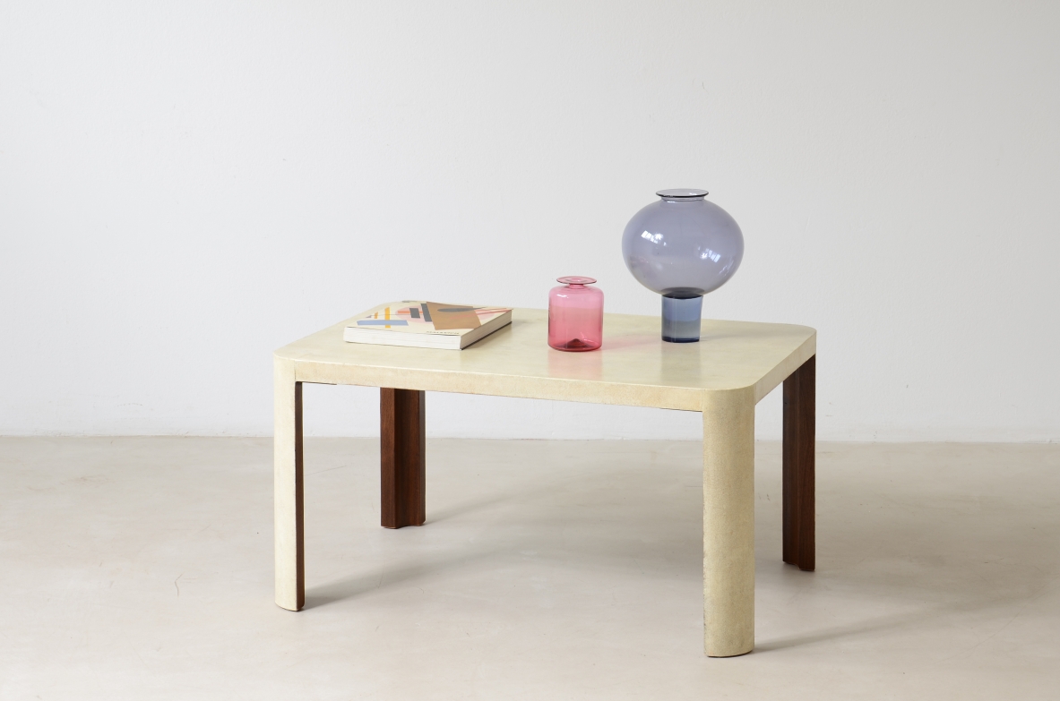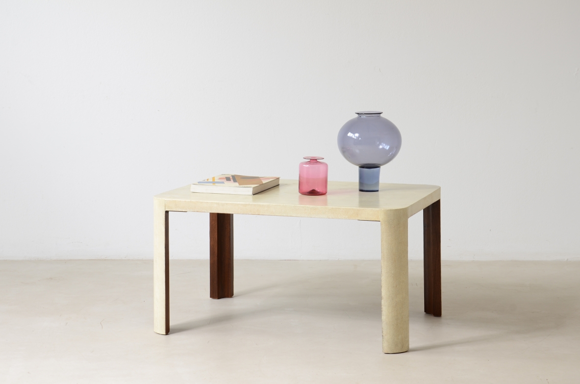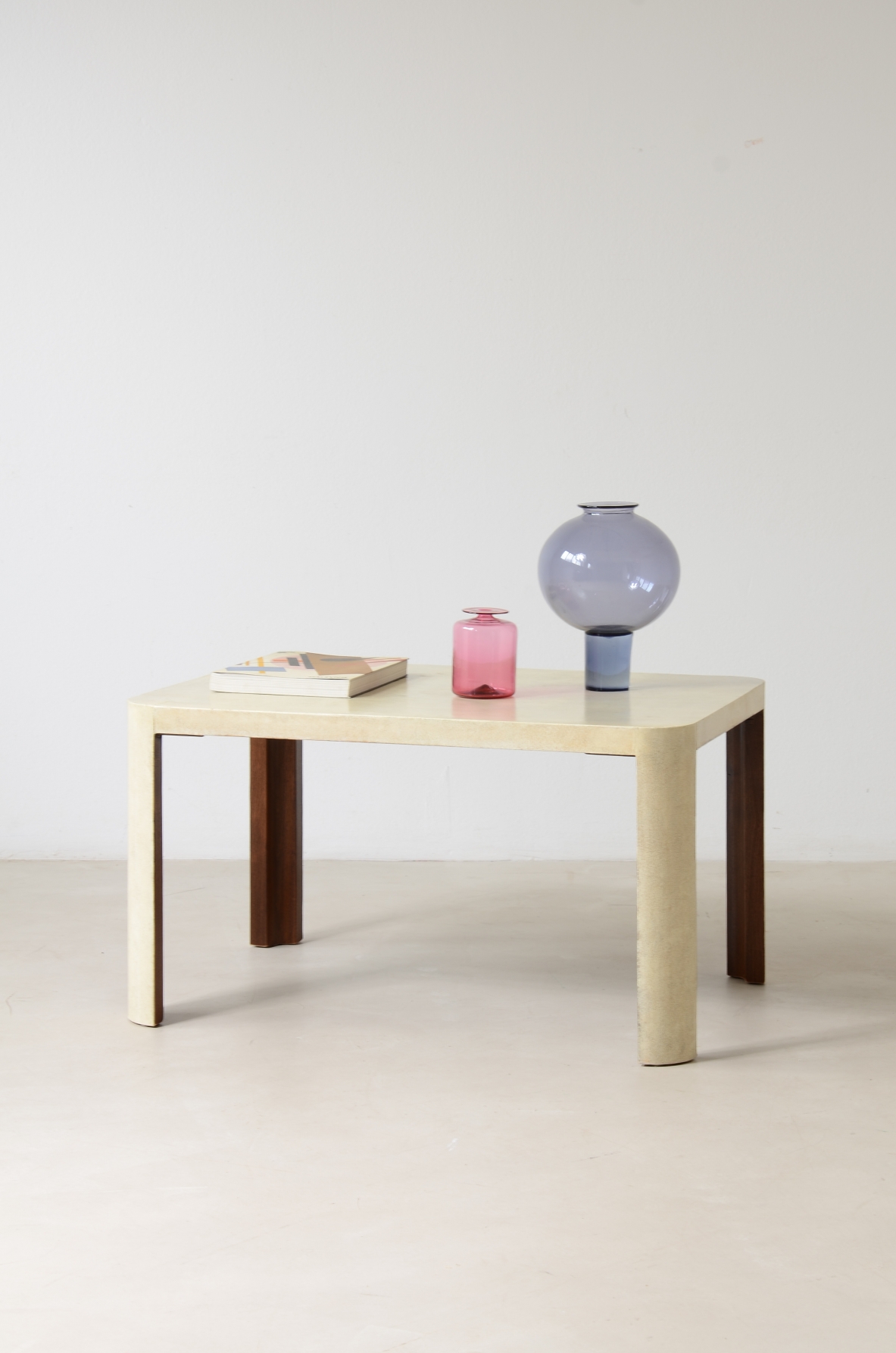Elegante tavolino in legno rivestito in pergamena con gambe in legno tinto e sagomato.